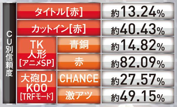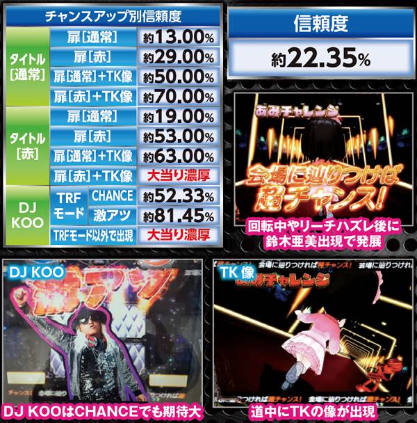 通常タイトルと比べ赤色の場合は、全チャンスアップで信頼度UP。DJ KOO出現時の信頼度は高い。