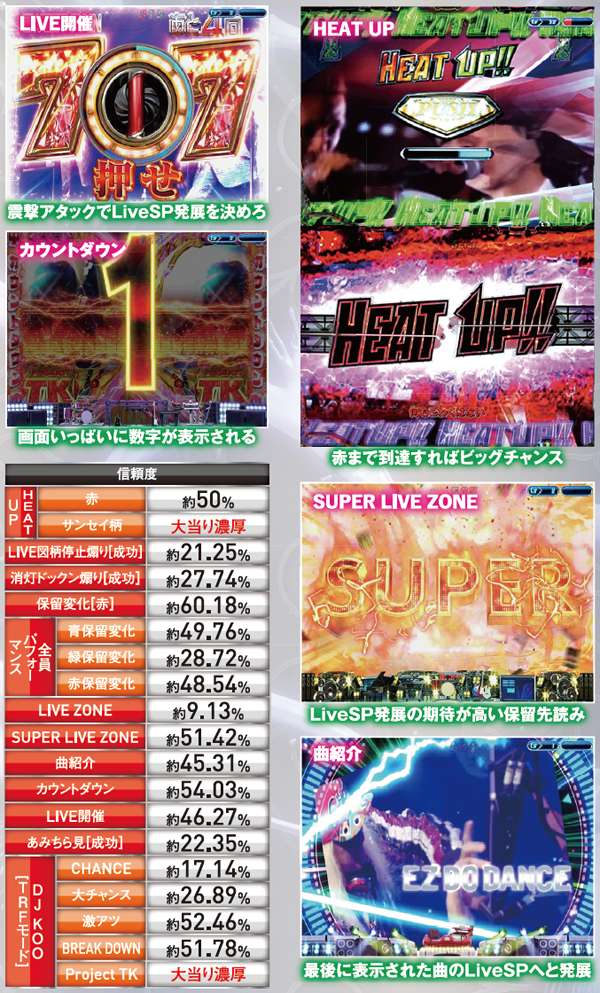 HEAT UPに限らず、赤系が出現すればチャンス! また、TRFモード選択時は、DJ KOOのセリフにも注目しよう。
