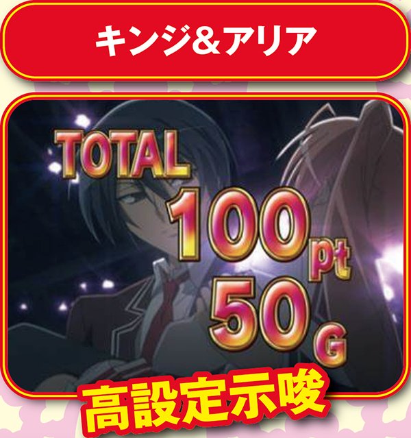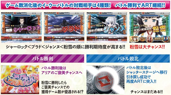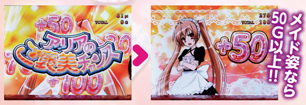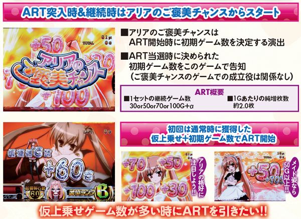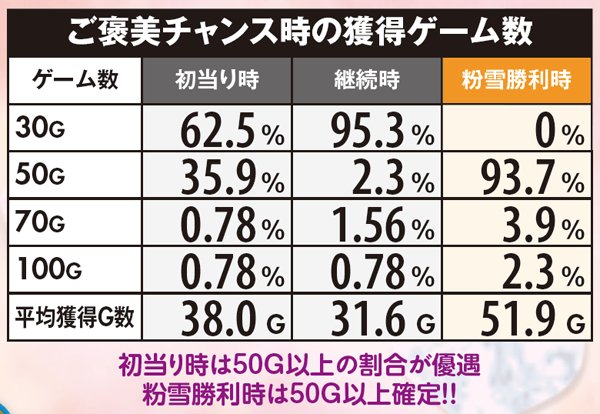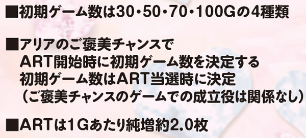 ART初期ゲーム数は30~100Gの4種類で、初当り時は約40%で50G以上を選択。継続時は基本的に30Gが選ばれるが、粉雪勝利時は50G以上が約束され、70Gor100G選択率も最も優遇されている。なお、アリアが制服ではなくメイド服なら50G以上確定だ。