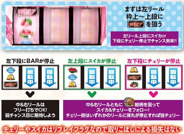 まず左リール枠上~上段にBAR絵柄を狙い、左上段にスイカor左下段にチェリーが停止したら残りリールに弾丸絵柄をフォローすればOK。フリー打ち消化でもコインロスは一切ないが、成立役を迅速に察知するためには必ず実践すべきであろう。