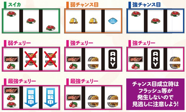 チャンス役はご覧の6種類で、チャンス目は強弱の2種類。チェリーは3種類用意されているが、最強チェリーはかなりのレアフラグと考えられる。よって、実質的に期待大となるのは強チェリーや強チャンス目。稀に共通ベルで各種抽選に当選することもある。