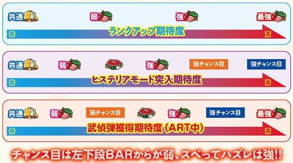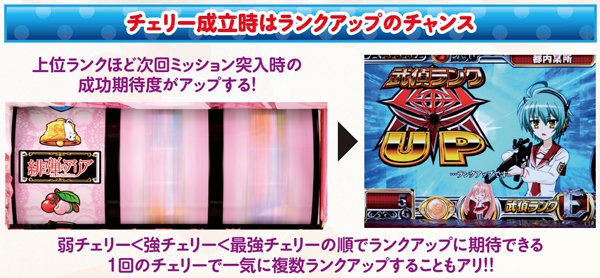 通常時、ART中ともにランクは主にチェリーを機に昇格。1回のチェリーで複数ランクアップすることもあり、ランクが昇格するほど通常時のミッションクリアorART中のバトル勝利期待度が高まる。なお、ランクはミッションorバトル突入でクリア抽選される。