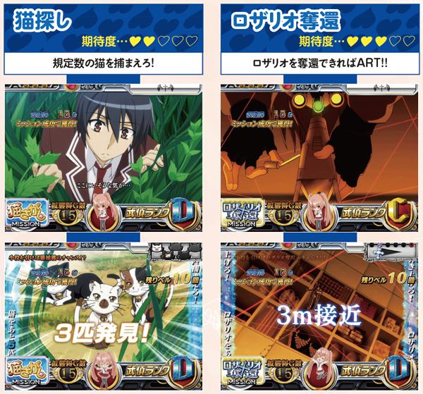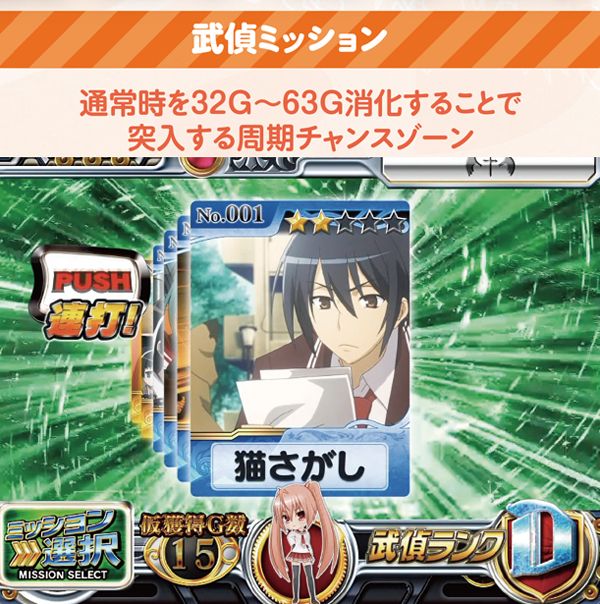 武偵ミッション突入時は背景色に注目。青や黄色は期待薄だが、緑以上であれば成功期待度の高いミッションが選ばれる可能性が高くなる。実戦上、武偵ミッションの継続ゲーム数は最大3G。ここまで継続した場合は高確率でARTに繋がるチャンスと思われる。