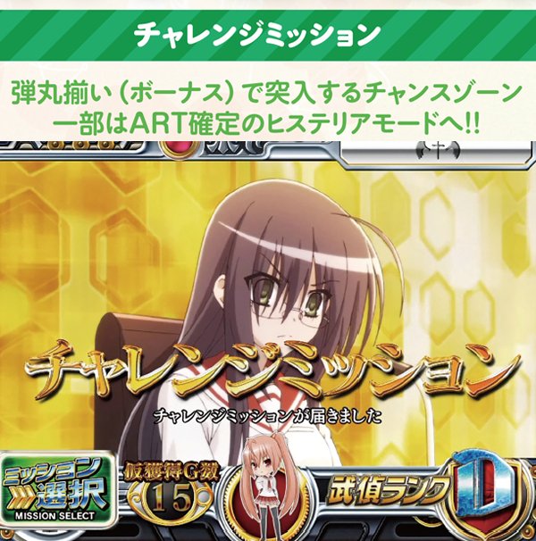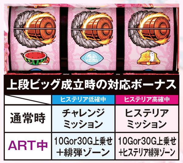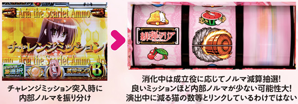 チャレンジミッションはリアルボーナス。消化中はチャンス目出現率が大幅にアップしており、ミッションと比べてミッション成功、即ちART当選期待度が高くなる。なお、弾丸揃いでヒステリアモードが発動した場合は、その時点でART確定だ。