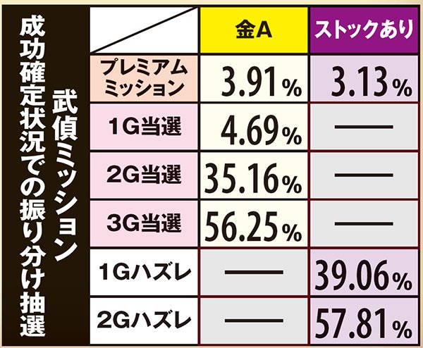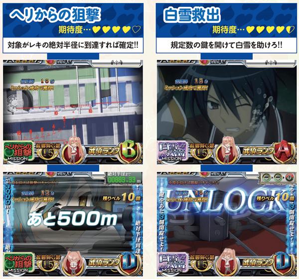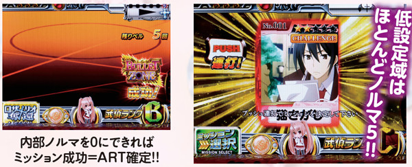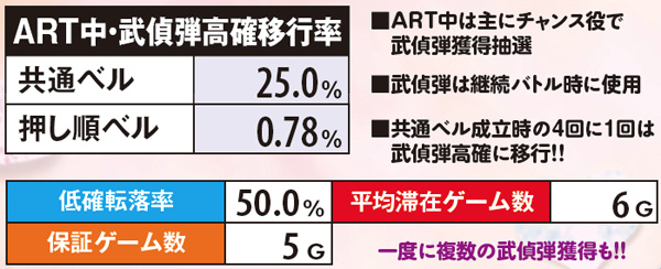 武偵ミッション発展時は状態とランクに応じてART抽選が行われ、告知までのゲーム数も決定。3Gまで継続した場合はランクを問わずART当選が約束される。なお、現時点で武偵ミッション低確or高確の見極めは難しい。