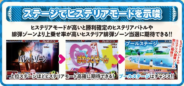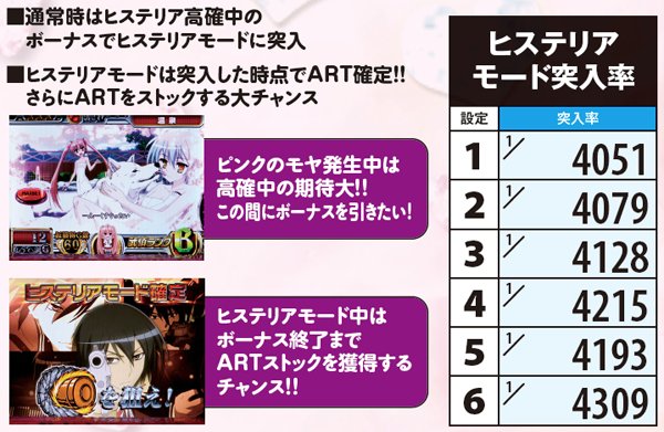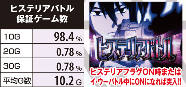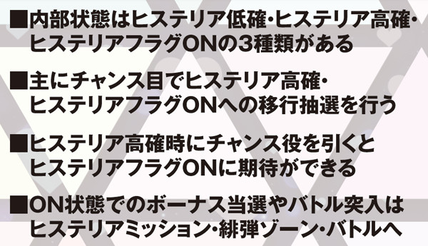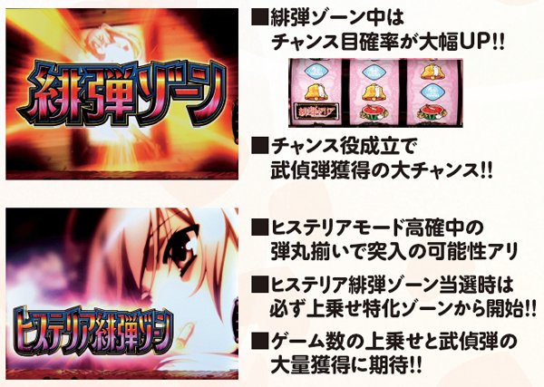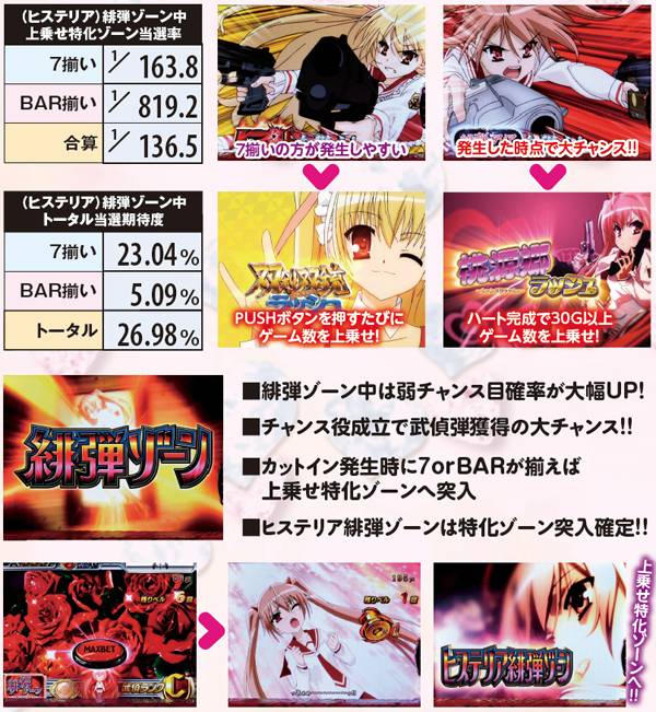 転落率は79.6%と高いので、ヒステリア高確昇格後は数ゲームが勝負所。通常時はART確定のヒステリアモード、ART中は勝利確定のヒステリアバトルor上乗せ特化ゾーンが確定するヒステリア緋弾ゾーン突入に期待でき、ヒステリアバトル中は武偵弾獲得抽選も高確率で行われる。