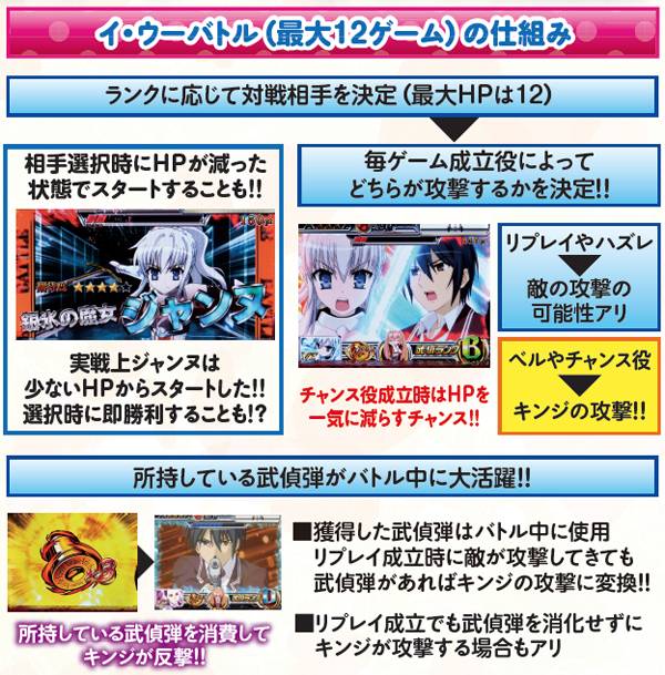 対戦相手はランクを参照して決定。ジャンヌ・粉雪は大チャンスで次セット継続の期待ができる。また、敵のHPは最大12で、減った状態からスタートするケースもあり。12個以上の武偵弾を持っていれば次セット継続は確定となるわけだが、少なくてもチャンス役を引ければ一気ダメージによる勝利も狙える。