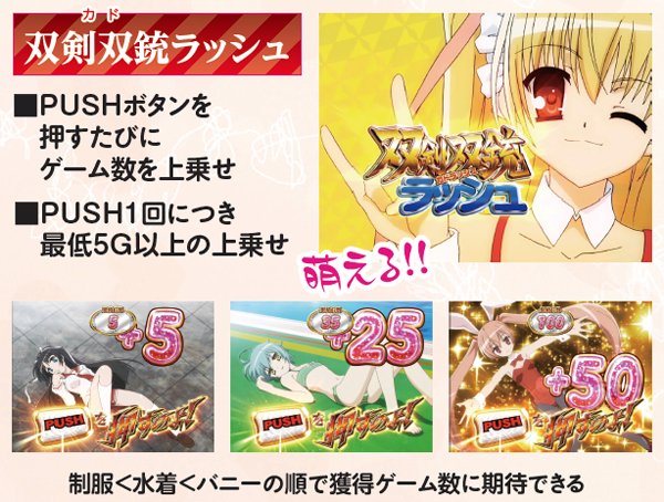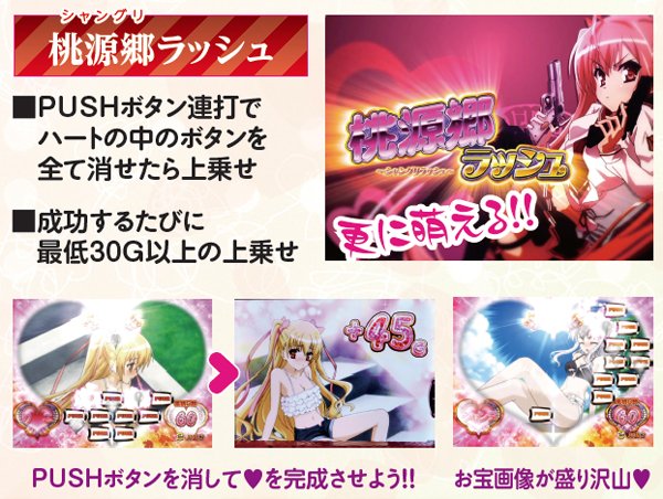 緋弾ゾーン中は武偵弾大量獲得の大チャンスで、消化中はカットイン発生時に7が揃えば双剣双銃(カド)ラッシュ、BARが揃えば桃源郷(シャングリ)ラッシュへ突入。カットインの種類は青→黄→赤の順に揃う期待が高まり、虹色は確定と思われる。