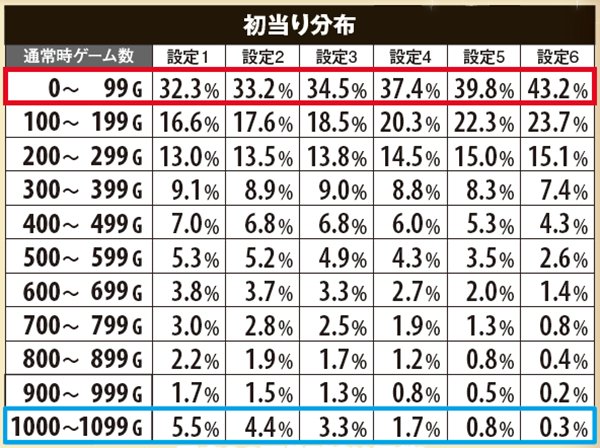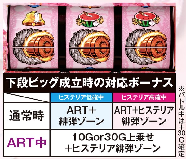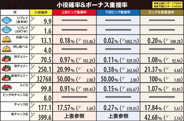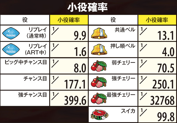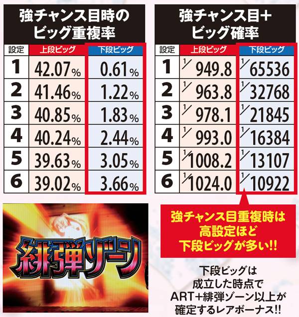 設定差のあるボーナスは強チャンス目からの下段ビッグで、その数値は設定に準じて上昇。設定1と6とで6倍の差となる。出現率自体の低さゆえ遭遇できる可能性こそ低いものの、知らずにスルーすると高設定をみすみす逃すことになるので必ず覚えておこう。