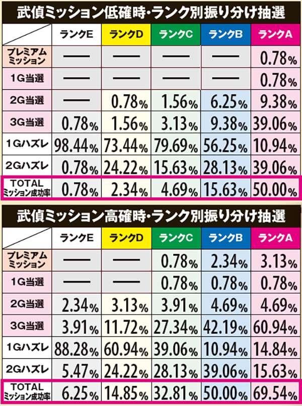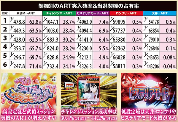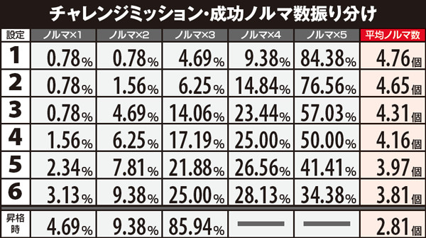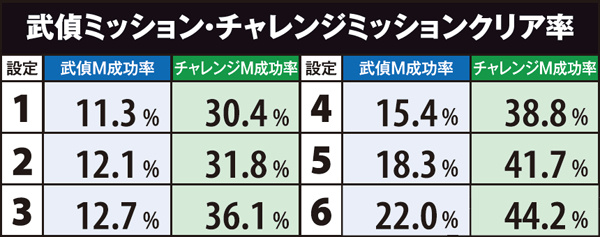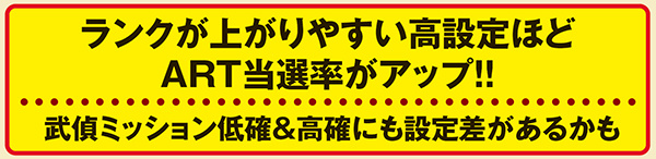 ART確定となるランク金A到達割合、武偵ミッション成功率は設定1と6とで約2倍の差、チャレンジミッション成功率は約1.4倍の差が生じている。基本的にランクが上がりやすく各種ミッションをクリアしやすい台は高設定…という認識で問題ないだろう。