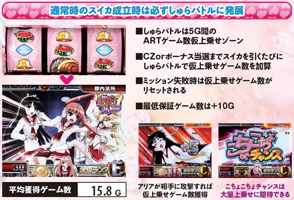 通常時のスイカを機に突入するしゅらバトルは5G継続。消化中は対戦キャラや攻撃パターンによって仮上乗せ期待度が変化し、実戦上は白雪よりも理子の方が期待大となる。また、こちょこちょチャンスへの発展は大量仮上乗せに期待できる。