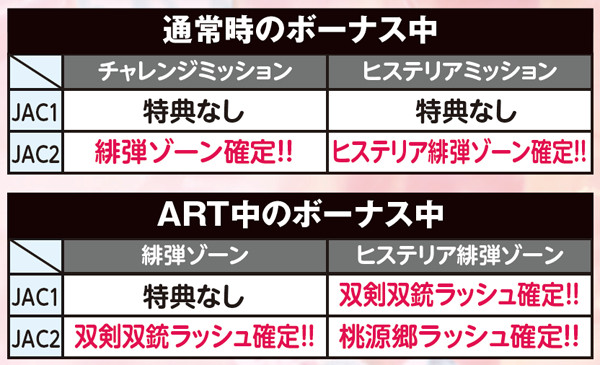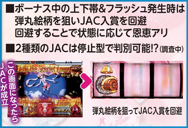 JACは内部的に2種類存在。JAC2は恩恵が大きく、通常時ならば緋弾ゾーン以上、ART中ならば上乗せ特化ゾーン突入が約束される。なお、JAC中の上下帯&フラッシュ発生時はいずれかのリールに弾丸絵柄を狙ってJAC入賞を回避しよう。