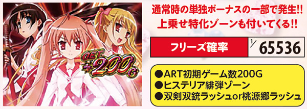 フリーズが発生するのは通常時のみで、その確率は65536分の1。首尾よく射止めればART200G+ヒステリア緋弾ゾーン&上乗せ特化ゾーンが約束されるので、ARTロング継続は約束されたも同然だ。リールロック発生時は3段階発展まで期待しよう。