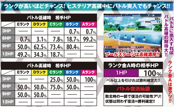 バトル時の敵HP数はランクとバトル状態を参照して決定。ランクが低くてもヒステリア高確中にバトルへ突入した場合はバトル高確の可能性があり、選択されるHPは最大でも9。勝利への大チャンスといえる。