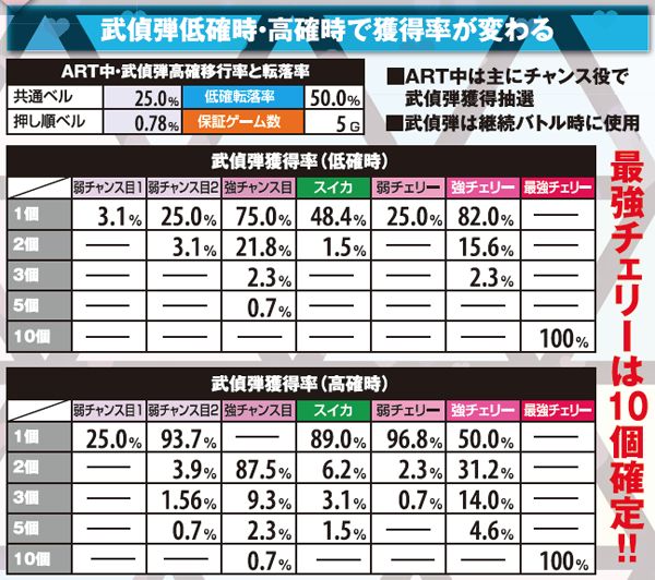 ART中の武偵弾獲得期待度は内部状態で変化し、武偵弾高確中はチャンス役成立で武偵弾獲得確定。弱チャンス目1はビッグ中のみ出現するチャンス目だ。