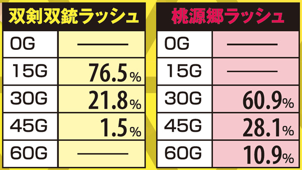 どちらの保証ゲーム数も少ない数値だが、桃源郷ならば一度に最低30G、双剣双銃でも一度に30G乗せることもある。