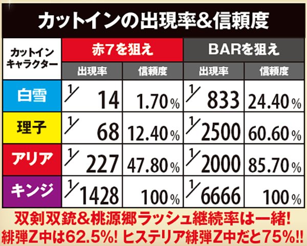 赤7とBARどちらでもキンジなら絵柄揃い確定。BARカットインは出現率自体が低く、白雪であっても出現すれば4回に1回程度の割合で桃源郷ラッシュへ繋がる。なお、ヒステリア緋弾ゾーンはいずれかの特化ゾーン突入が確定する。