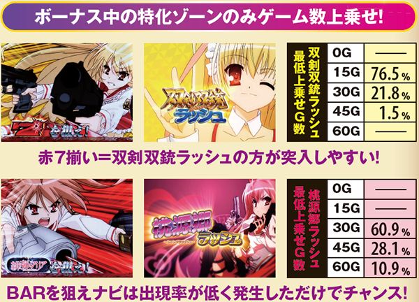 緋弾ゾーン中は武偵弾獲得期待度がアップするだけでなく上乗せ特化ゾーン突入抽選も行われ、7揃いは双剣双銃ラッシュ、BAR揃いは桃源郷ラッシュへ突入。各種絵柄揃いを示唆するカットインは4種類あるが、BAR狙いのカットインは発生した時点で大チャンスとなるようだ。