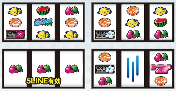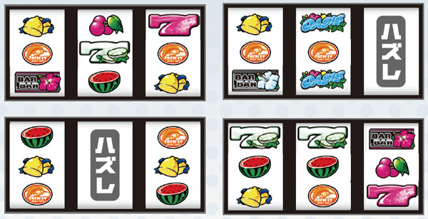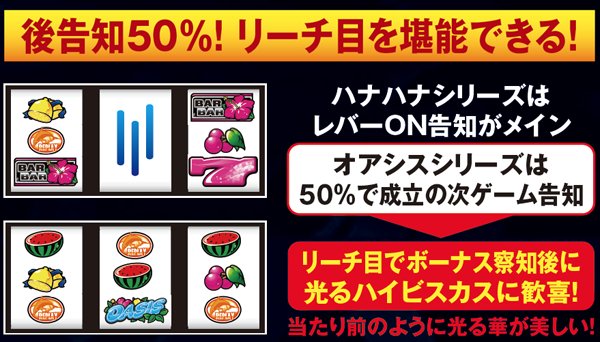 レバーONメインのハナハナとは告知タイミングの振り分けが異なり、スーパーオアシスはリーチ目を堪能しやすいマシンとなっている。