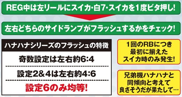 まず左リールにスイカをビタ押しし、残りリールもスイカ狙い。1度だけスイカを揃えてサイドランプの光り方に注目しよう。ハナハナは奇数は左、偶数は右が光りやすく、設定6は均等だった。