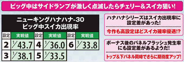 ハナハナシリーズ同様、今作もビッグ中のスイカ確率に設定差がある模様だ。