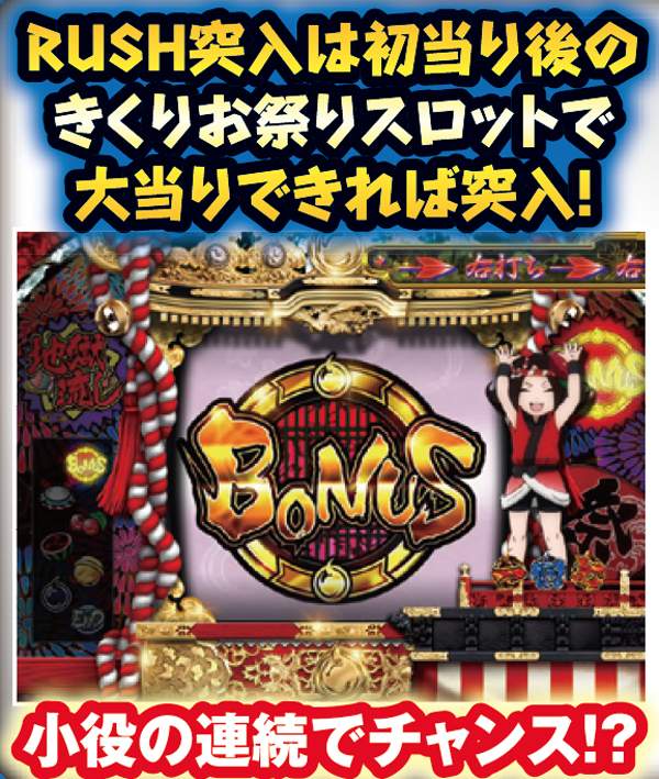 初当りのラウンド中にボタンを押して成功すれば電サポ8or16回転のきくりお祭りスロットへ。この間はリールに止まる小役の種類が重要になり、「ベル」以外なら期待大。