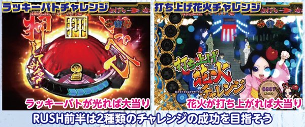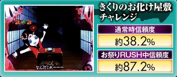 お祭りRUSH中は、回転数に応じて演出が変化する。前半の27回転目までは即当りがメインで、打ち上げ花火チャレンジorラッキーパトチャレンジを選択。それ以降は、きくりとあいが活躍する賑やか演出のお祭りモードへ。