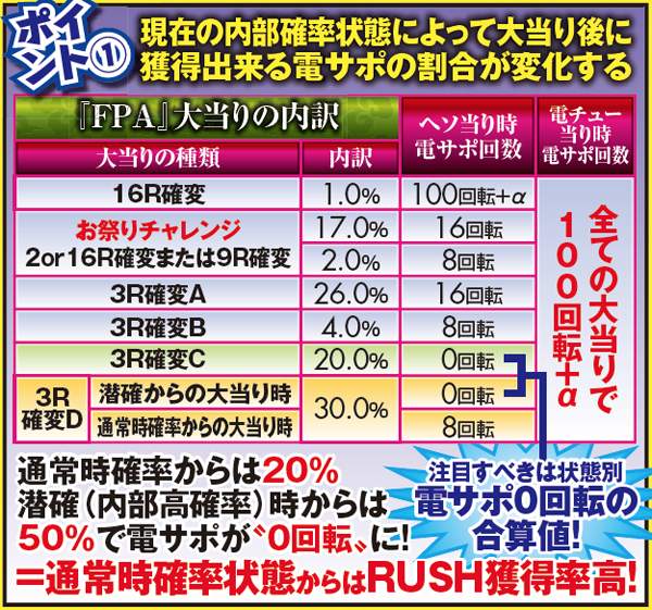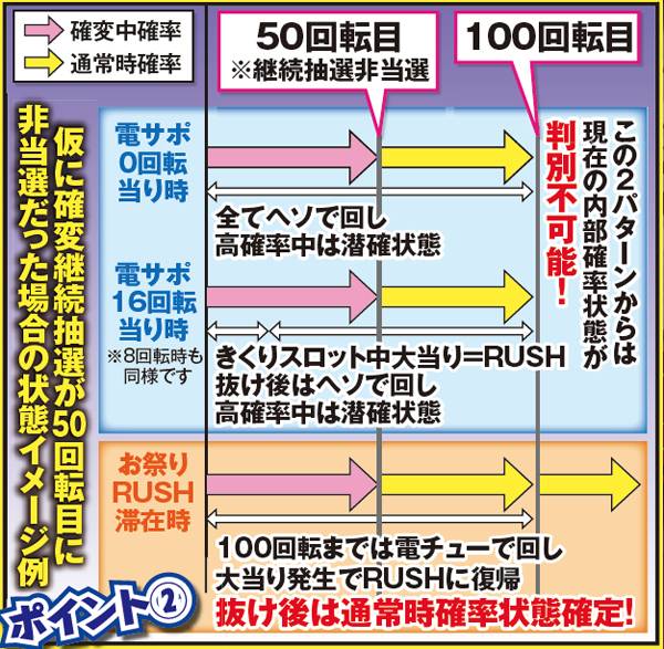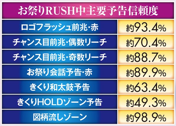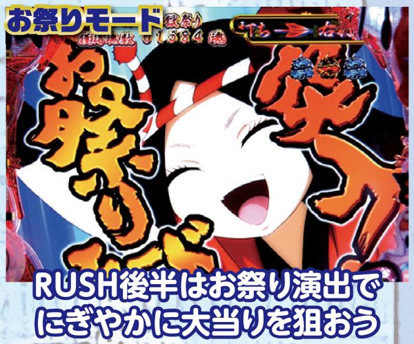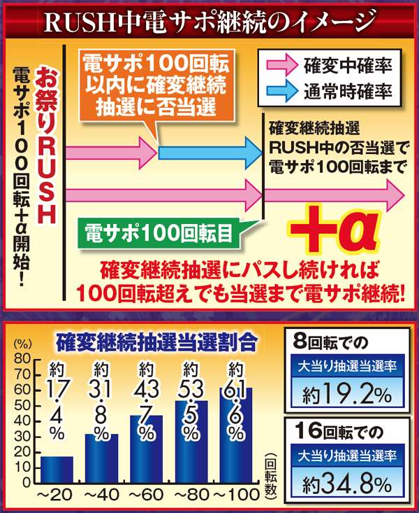 お祭りRUSH中は確変継続抽選にパスし続ける限り確変状態。途中で転落しても電サポは100回転まで付く仕組み。RUSH継続率は約90%と非常に高い。