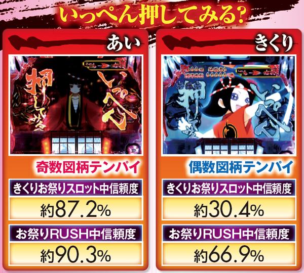 きくりお祭りスロットとお祭りRUSH、いずれも「いっぺん押してみる?」への発展に期待。奇数テンパイ&高信頼度のあいの方がアツい。