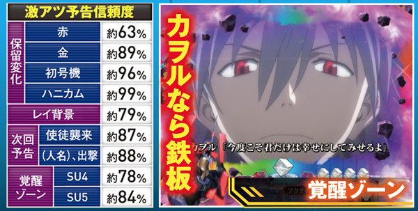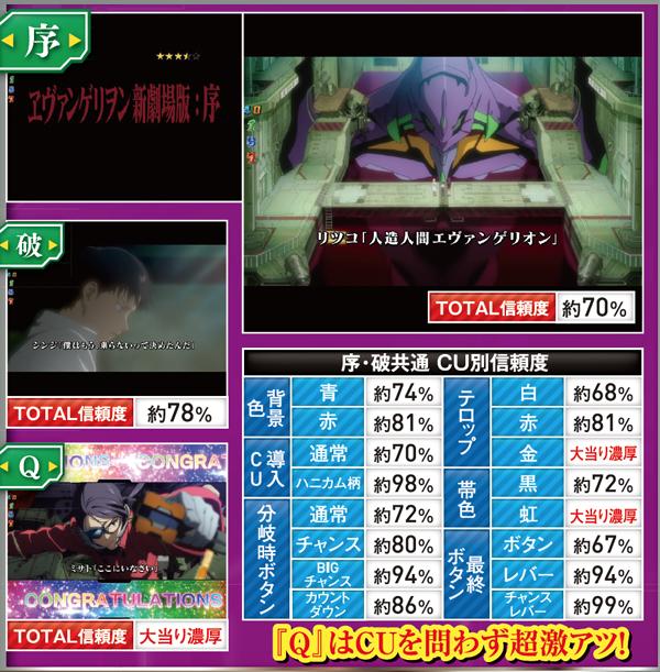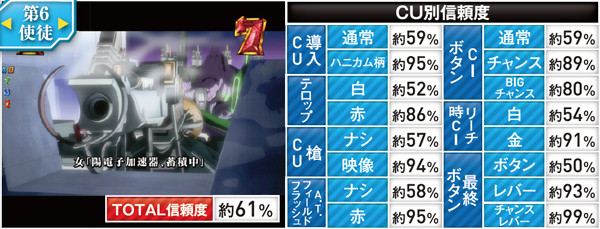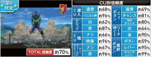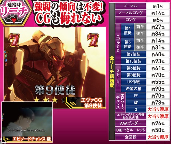 赤やハニカム柄などへの変化が高信頼度のカギだ。なお、テロップ金、ロンギヌスの槍役モノ完成、使徒名金、虹ボタンはいずれも大当り濃厚となる。