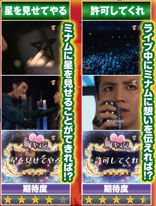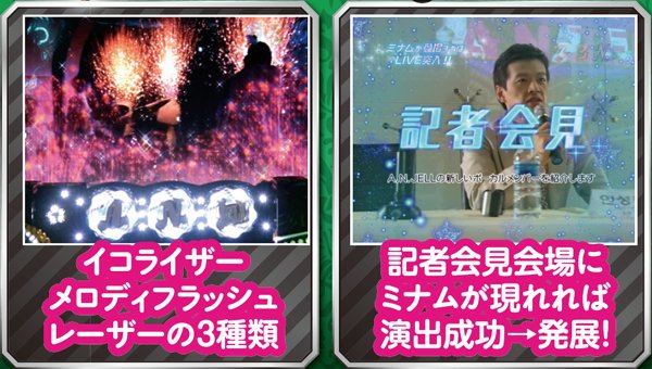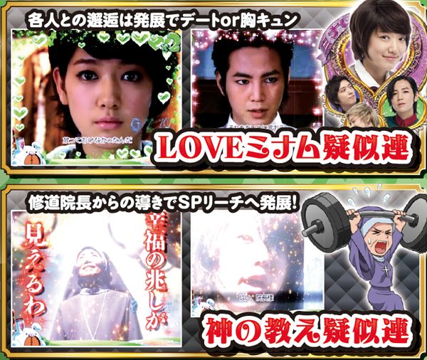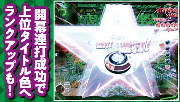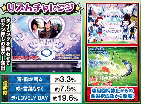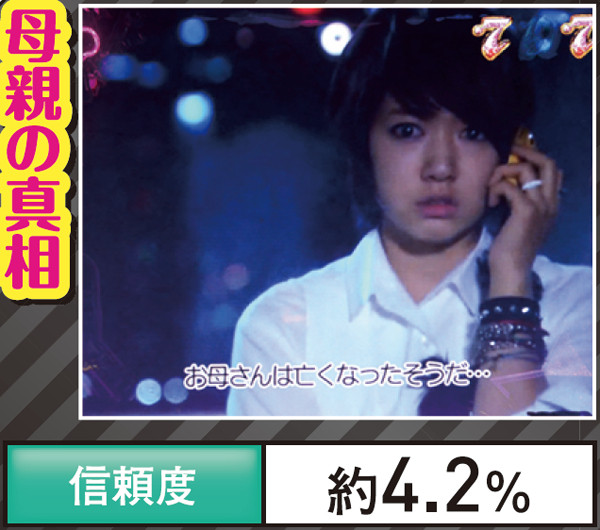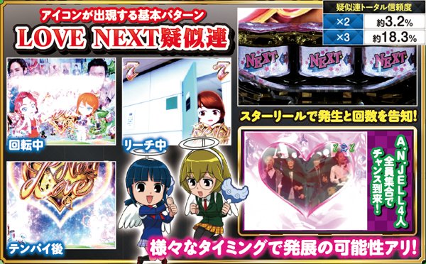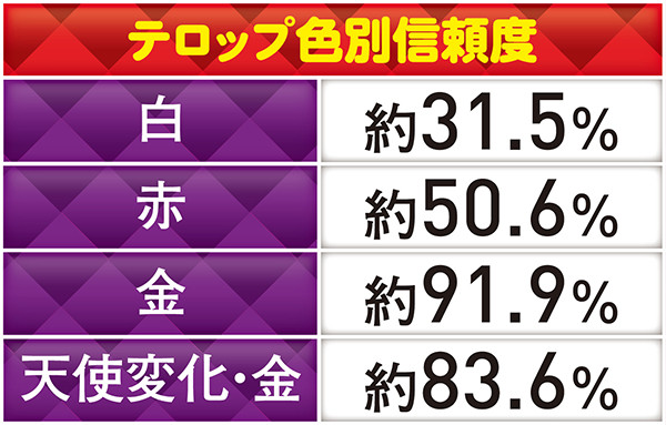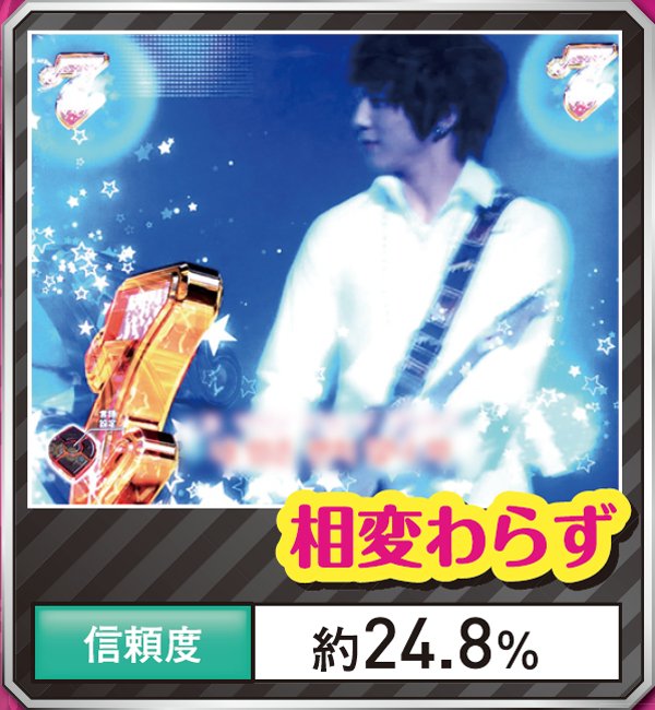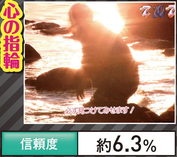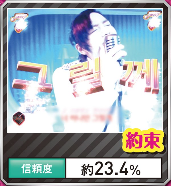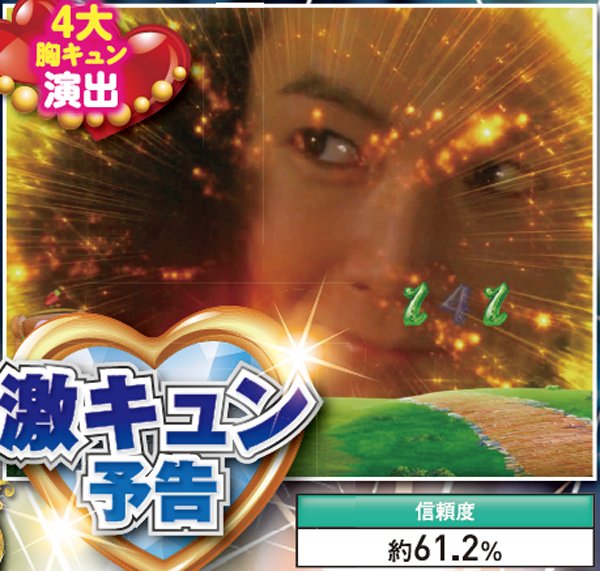多彩な種類とタイミングがあるが、いずれにしろ3回継続するかが最大のポイント。実戦上、キャラ系リーチ発展直後に継続、および神の教え疑似連の場合はスーパー発展濃厚&信頼度アップとなった。