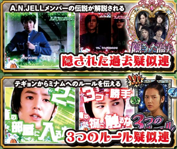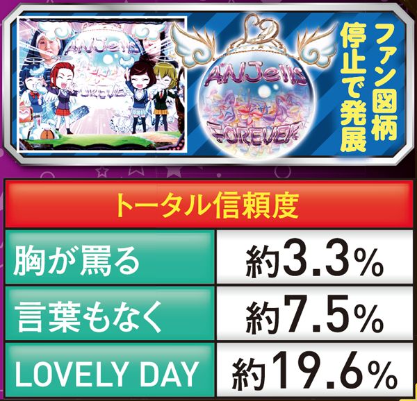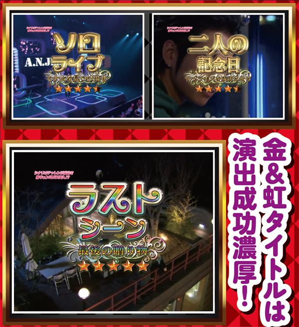 チャレンジに成功し、LIVEへ発展するかが鍵。実写系なら発展の期待大だ。発展経路は、バラケ目で中央3or7図柄停止、A.N.JELL図柄揃いなど多彩。