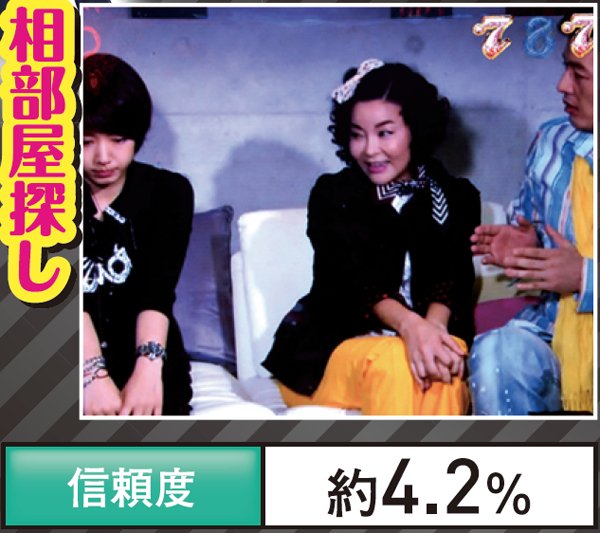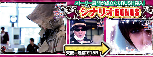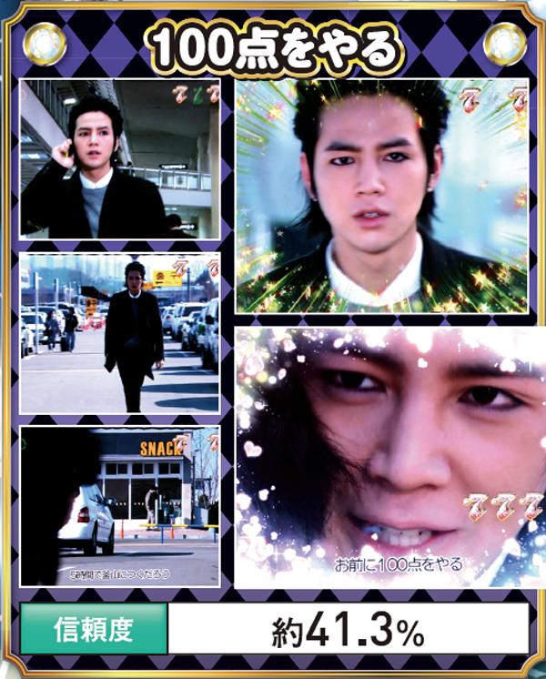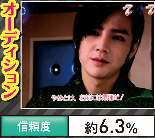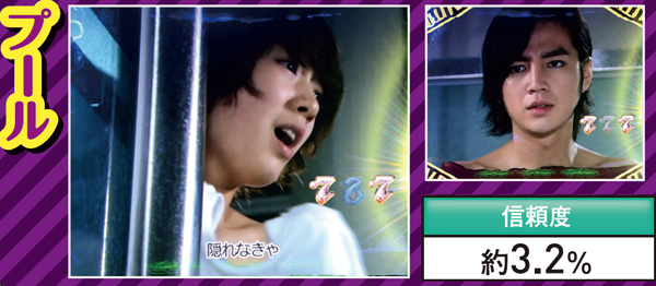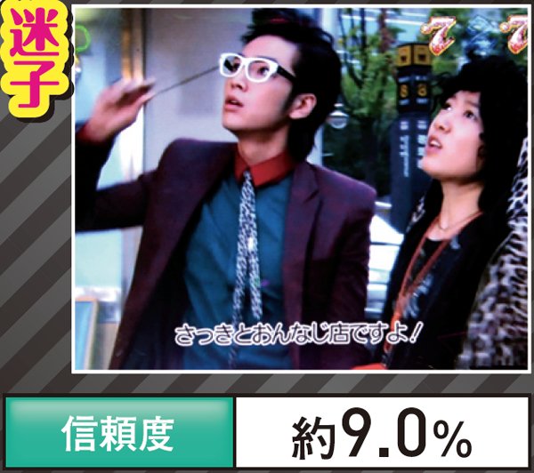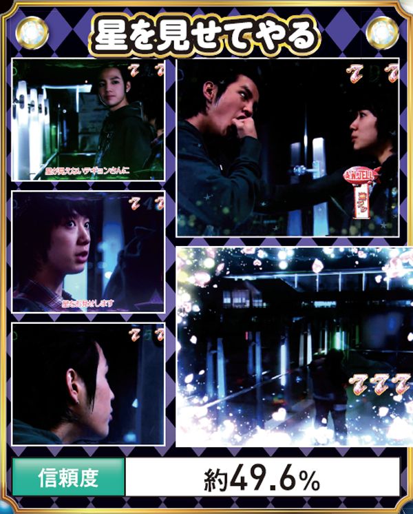 実写映像で展開されるが、期待度は総じて低め。ただし、複合した予告やリーチ中のチャンスアップによっては大当りも射程圏内。とくに金色系の演出は、いずれもハイチャンスだ。