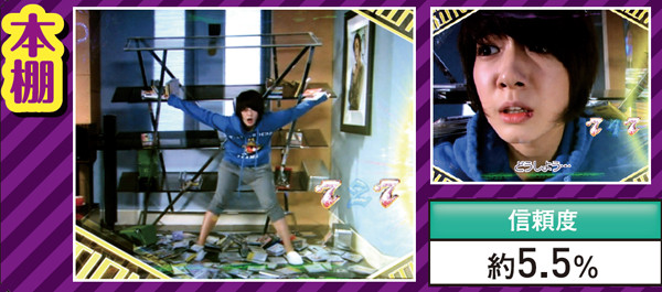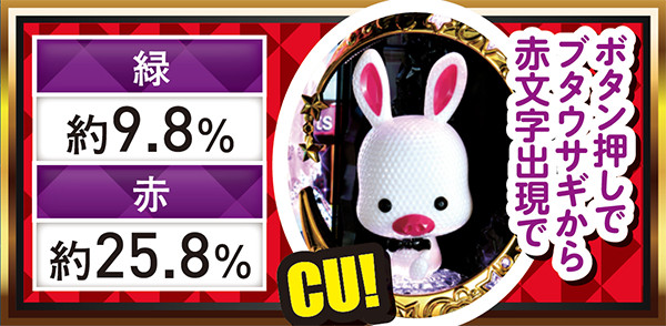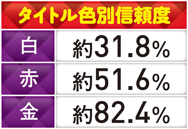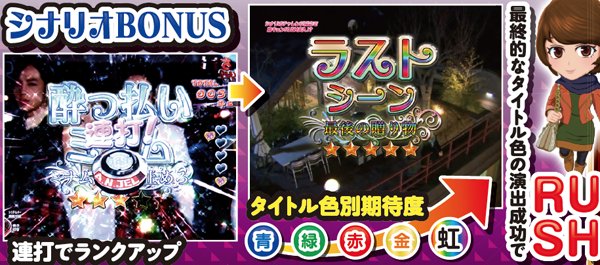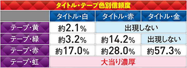 ここで直接大当りを狙うよりもハズレ後のオペチャレ発展が王道パターンだが、タイトルが金色ならば十分に期待できる。なお、テープが虹でもRUSH突入までは確定しないので注意。