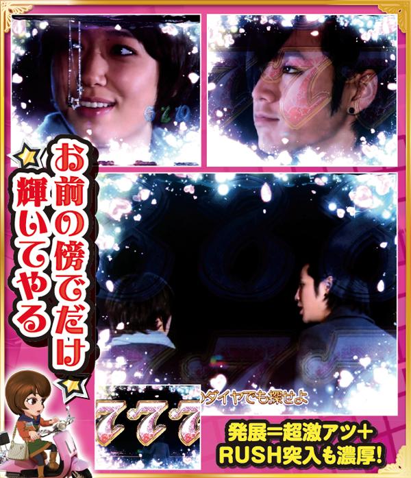 胸キュンですねリーチに含まれてはいるが、発展した時点で大当り&RUSH突入までが濃厚となる全回転リーチ。お互いが素直な気持ちを伝え合う最終回の最も感動的なシーンをバックに、静かに7が揃うのを見守ろう。