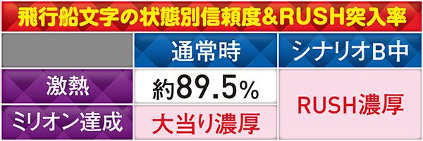 CUパターン信頼度は、各胸キュンリーチトータルの数値。一見してわかるとおり、とにかく金色が出現すればハズれる方がレアという超高信頼度を誇るのだ。また、初当り中の飛行船文字でRUSH濃厚となるプレミアムパターンも見逃せない。