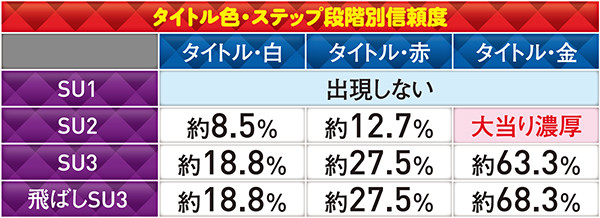 注目すべきは、画面左上に表示されるステップ段階。大当りには当然ながらSU3到達が望ましいが、タイトル 金でSU2止まりなら超激アツとなる隠れ法則にも要注目。