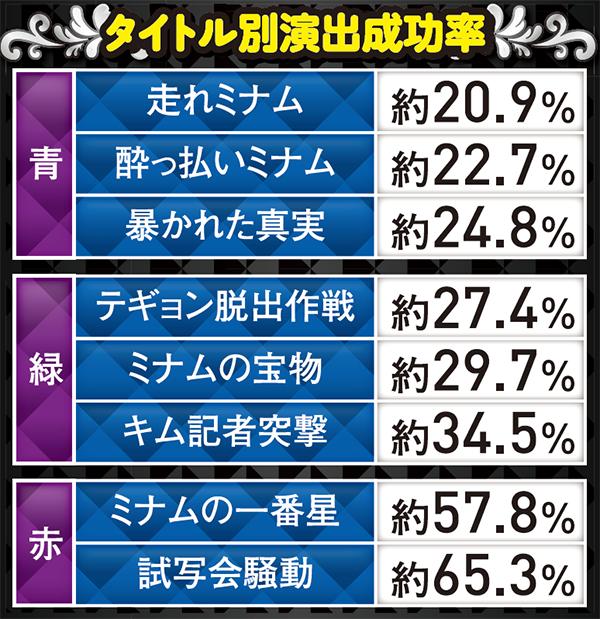 | 確変突入率 | 62.8%(突入率) 79.6(継続率) |