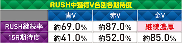 獲得Vの色で継続率が示唆されるRUSH中の2モードでは、やはり継続濃厚&ほぼ15Rとなる金Vに注目したい。