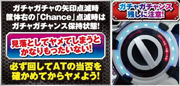 ガチャガチャンスはAT中の擬似ボーナスや特化ゾーン中、通常時のブレイクタイム中を除いて使用できる。権利所持時はガチャガチャの矢印が赤く光ったり、リール枠右にあるチャンスランプが点灯する。本機に慣れるまでは権利を持っているのを忘れてヤメないよう意識しておこう。