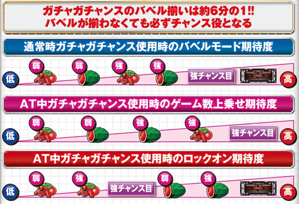 通常時はAT直撃、AT中ならロックオンとなるバベル揃いは約6分の1。ガチャガチャンスを使うと決めたらガチャガチャを回し、気合を入れてレバーを叩こう。バベルが揃わなくても必ずチャンス役となるので、期待感は続く。
