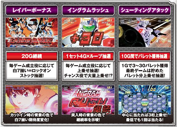 ロックオン告知後は、プッシュボタンでボーナスorイングラムラッシュorシューティングラッシュのいずれかを告知。レイバーボーナス開始時に役モノが落下したら、白7揃い期待度が大幅にアップするハイパーボーナスに格上げされる。シューティングラッシュは貯めたバレットで的の中心を射抜くたびに3桁上乗せ。最大30マス(当り1マス)なので、最低でも100G獲得できる。