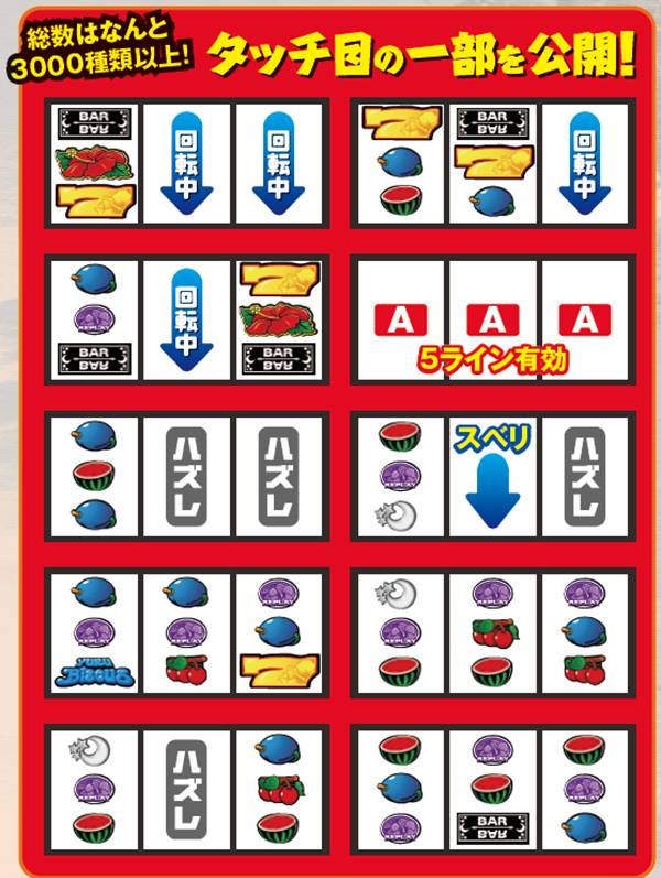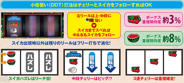 DDT打法手順は、左リール上or中段に3番チェリーを狙う、所謂チェリー落とし。スイカを引き込んだ際はスイカ成立が濃厚だが、ここでスイカがハズれた場合はリーチ目、即ちタッチ目となる。多くのタッチ目を見付けられれば、より一層興奮は高まるだろう。