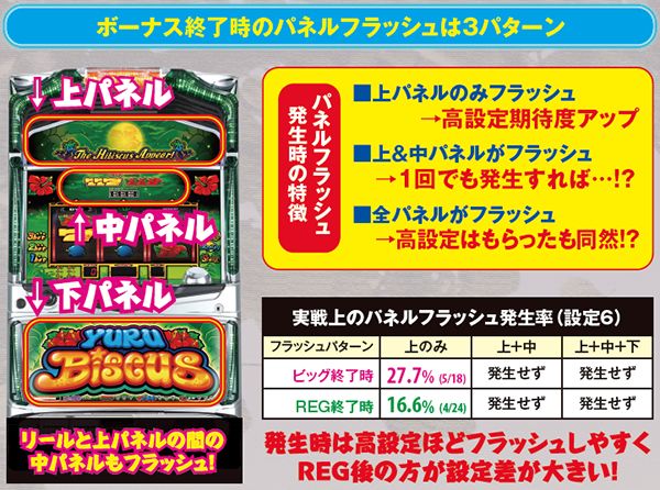 パネルフラッシュは3パターンで、上パネフラ発生時は高設定に期待。REG後であれば、その期待度がさらに高まる。上&中、全パネフラは実戦で発生せず。発生率はかなり低いと思われるので、万が一発生した場合は打ち続けてみたほうが良いかもしれない。