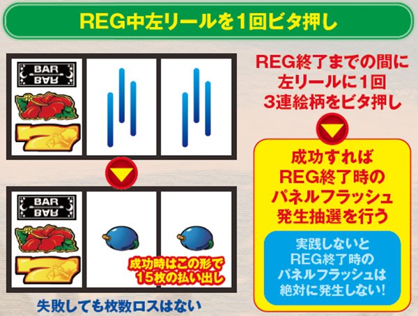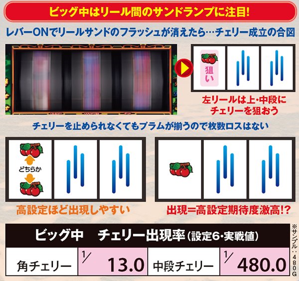ビッグ中のチェリーは高設定ほど出現しやすく、中段チェリー成立は高設定濃厚となる模様。また、REG中は1回左リールをビタ押しすることで、消化後のパネフラ抽選を受けられる。どちらも設定推測には欠かせないポイントなので、しっかりと目押ししよう。なお、ビッグ中のチェリーはプラムと重複しており、コインロスの心配はない。