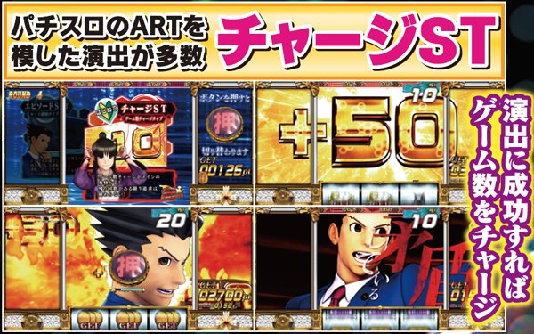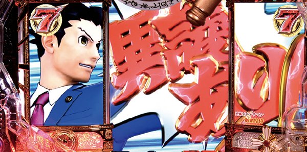 主要となる裁判系リーチでは証人の供述や証拠品などを巡り、展開の優劣を示すゲージの動きで結果が変動。成歩堂の勝利で大当りに!