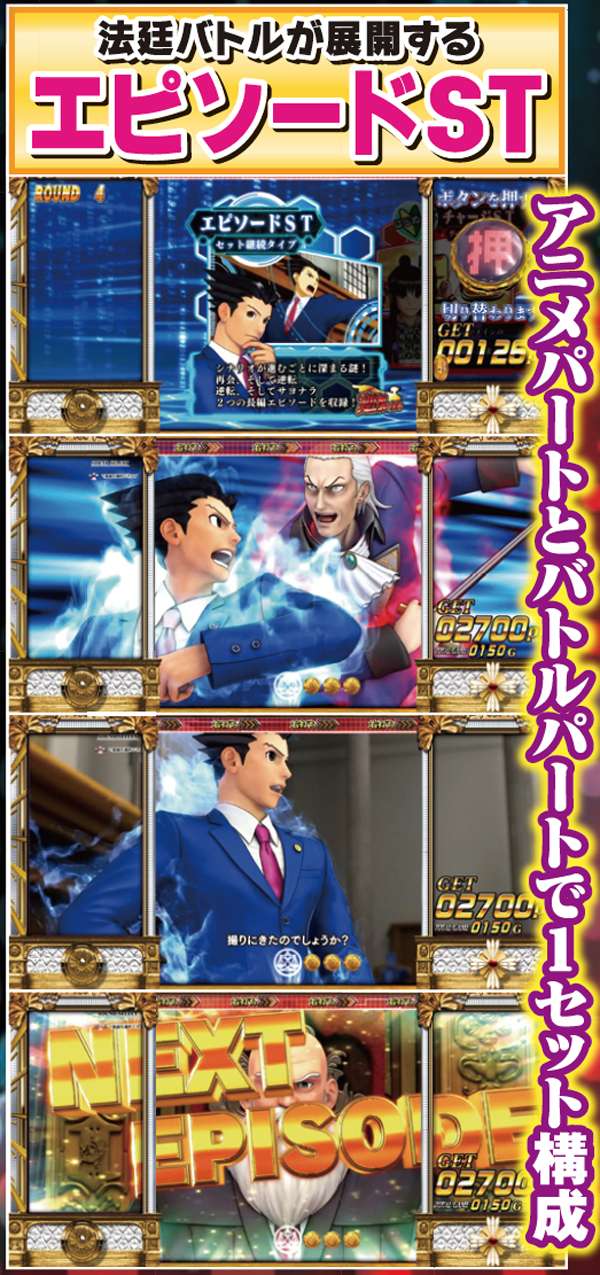 大人気法廷バトルゲーム『逆転裁判』がパチンコ化! 「STの常識に意義あり!」を掲げて、V-STに加えてアタッカーショート開放の小当り頻発で出玉上乗せを図る機能「SKR」を搭載している。またST中はお好みで、パチスロのARTを模したチャージSTと、手に汗握る法廷バトルを体感できるエピソードSTが選べるのが特徴だ。 |
