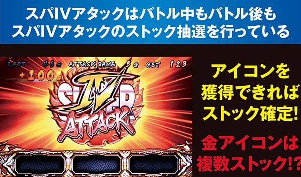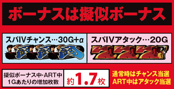 ボーナスは擬似ボーナスとなっており、スパIVチャンスなら30G+α継続、スパIVアタックなら20G継続。ボーナスはART突入契機であり、出玉促進も担っている重要な要素だ。