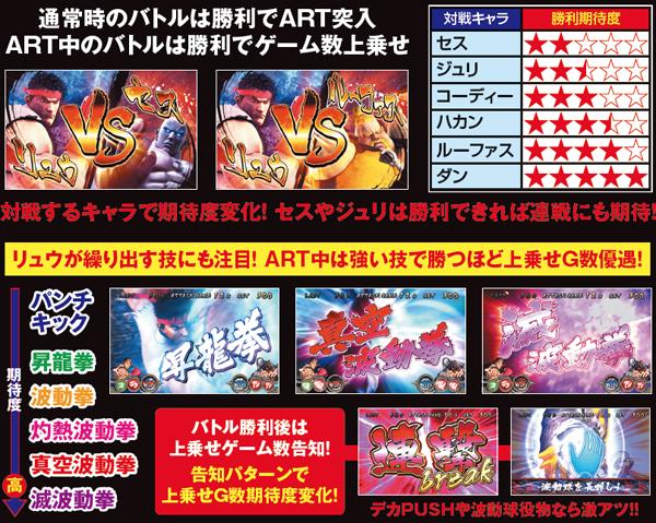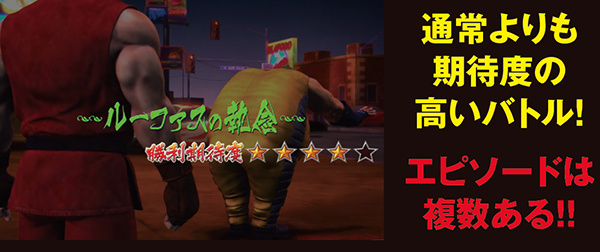 通常時orART中問わず、バトルは3ポイント先取で勝利。対戦相手や攻防パターンによって勝利期待度が示唆される。また、ART中は強い技で勝利するほど上乗せゲーム数に期待できるため、強攻撃時はその後の展開に注目したい。