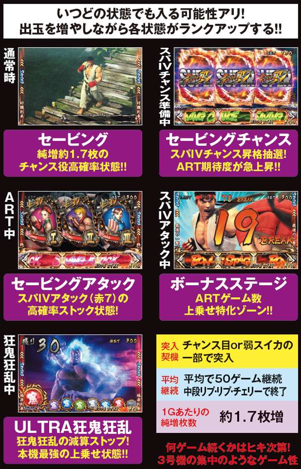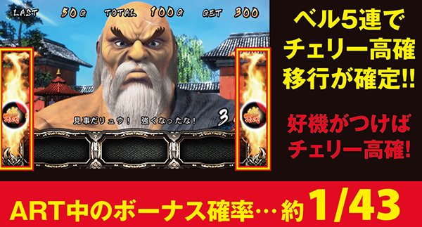 | 機種概要 | まばゆく放たれるその光の色は、武芸を究めんとする者が持つ「青」なのか、それとも殺意に満ちた「紫」なのか。専用筐体・波動を身にまとい、『スーパーストリートファイターⅣ パチスロエディション』が登場。 |